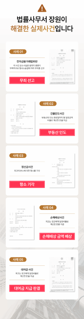 법률사무소 장원은 수많은 월세보증금반환 사건을 성공적으로 해결해 왔습니다. 증거 확보부터 내용증명 발송, 소송 진행, 강제집행까지 모든 과정을 원스톱으로 도와드립니다. 여러분의 소중한 보증금, 확실하게 되찾아 드리겠습니다.